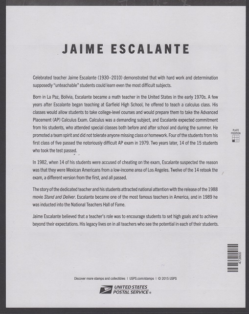 United States of America, Forever, 2016 The back side of the sheet has a biography of Escalante |