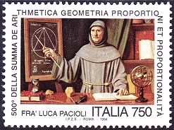 An Italian mathematician and Franciscan friar who wrote the 1494 Summa de arithmetica, geometria, proportioni et proportionalita. This textbook summarized all of the known mathematics, including the first printed work on algebra, and the first published account of double-entry accounting. Pacioli also produced a Latin translation of Euclid's Elements called Geometry, De viribus quantitatis, a book on mathematics and magic, and De Divina proportione, a book on mathematics and artist proportion including the golden ratio and skeletal solids. The De virbus quantitatis is considered by many to be the foundation of modern magic and mathematical puzzles.