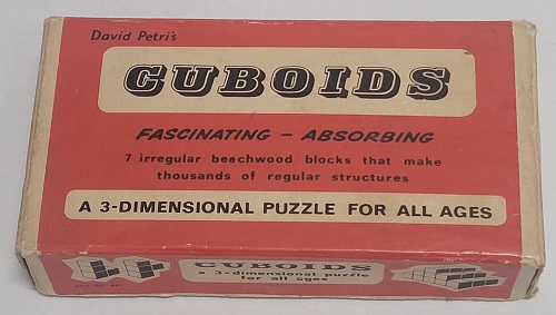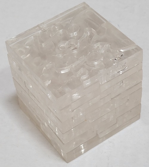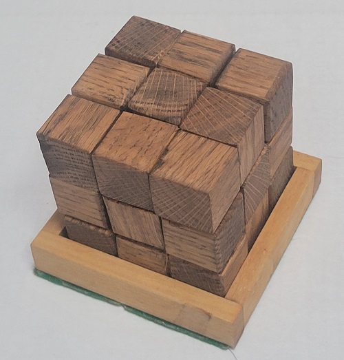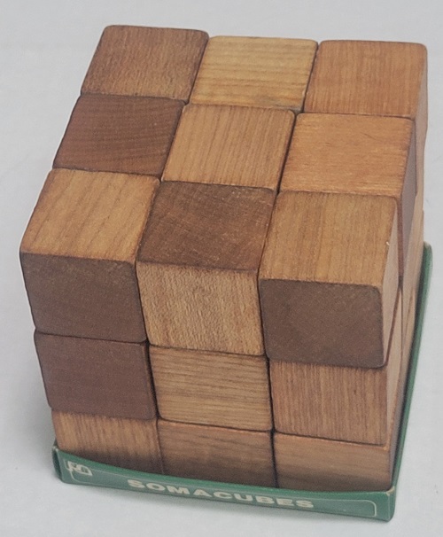A puzzle that creates a 3x3x3 cube, but the pieces are not Soma pieces. |