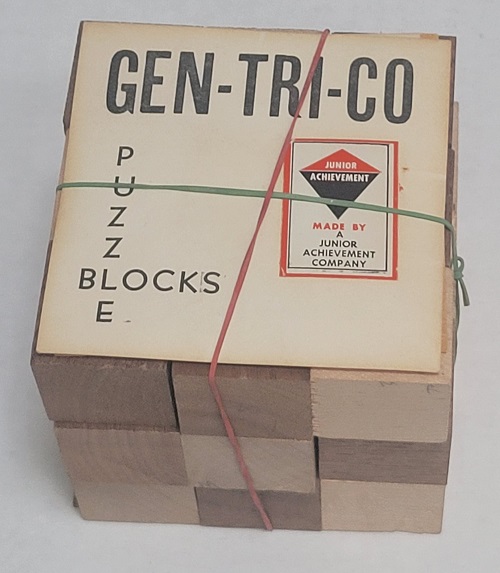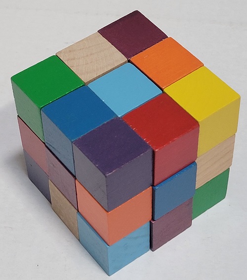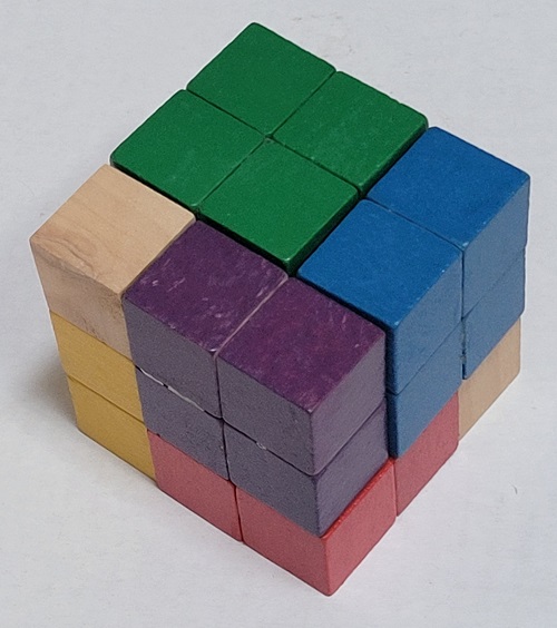 A handmade cube puzzle from 3 1x1x1 cubes and 6 2x2x1 pieces. |