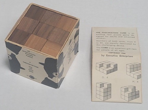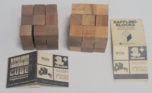 A pair of puzzles. The one on the left is a Fascinating cube puzzle. While the one on the right is a Baffling Blocks puzzle. Yet if you at the booklets, the exact same image is used on the second portion for both of these puzzles. |