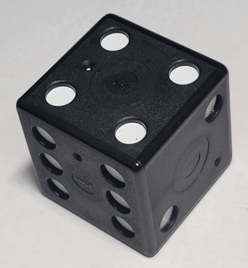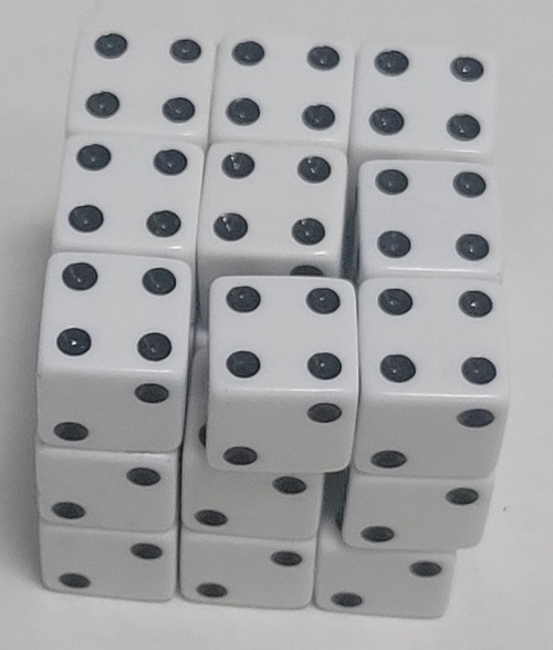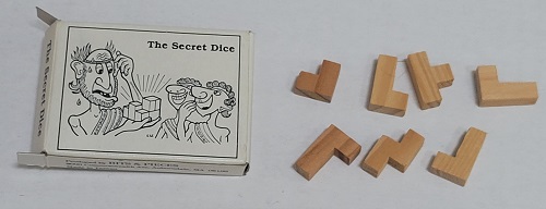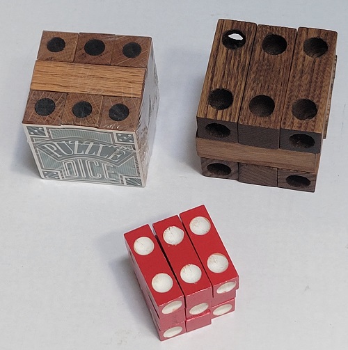 Several different dice puzzles. Each consists of 9 3x1x1 pieces which can be assembled into a cube that appears to be a die. |