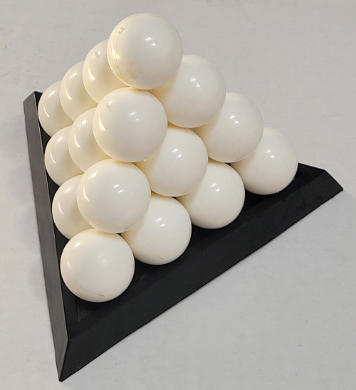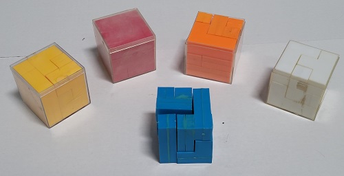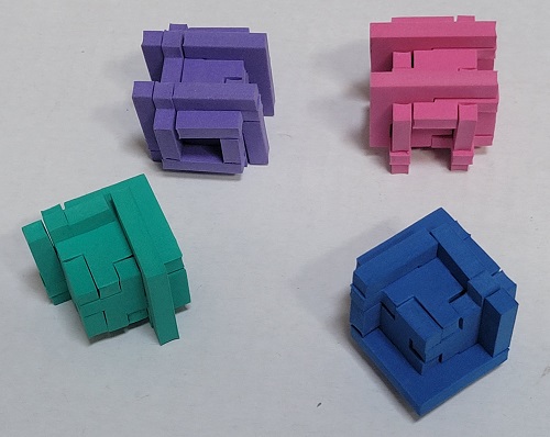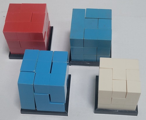 Four Soma cubes. While the simpliest construction is to create the cube, the Soma cube came with a booklet of a number of additional 3-dimensional shapes. |