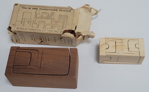 A furniture puzzle. The puzzle on the left is a single block of wood cut into 10 small pieces of furniture. The block on the right is my attempt to make a handmade version of this puzzle. |