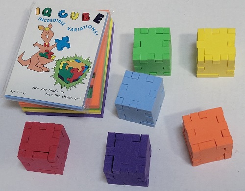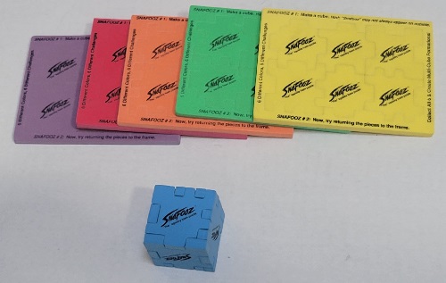 A set of Snafooz foam cube puzzles. Like the IQ cubes, the pieces form the exterior portion of the cube. |