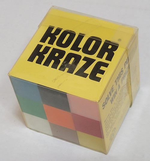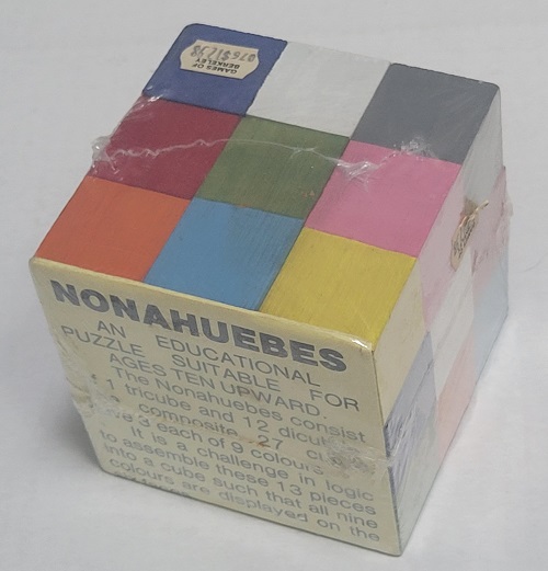 A handmade puzzle where the goal is to have all nine colors appear eactly once on each face of the cube. |