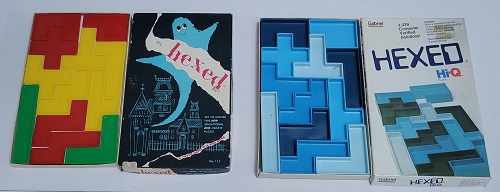 Two different Hexed puzzles. These are pentominos which consist of the 12 possible ways to arrange five squares with connected edges. |