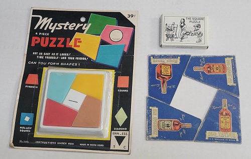 Several puzzles using 4 identical quadrilateral shapes to form a square. One is called the Mystery puzzle, another is small Bits & Pieces freebe, and the third shows 4 different bottles. |