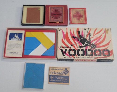 A collection of square dissection puzzles that are identical. One is called the Voodoo puzzle. |