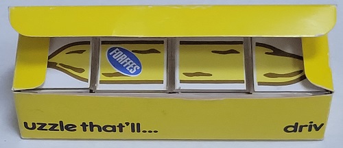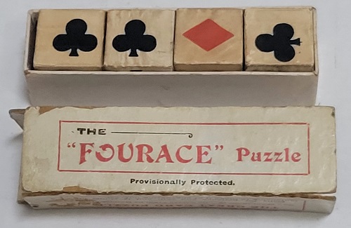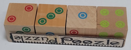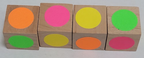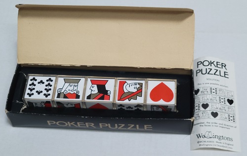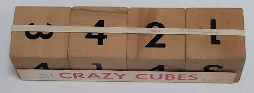 A Steiffel puzzle. Here we have 6 cubes, but interestingly enough the patterns are only on four sides of the cube, which makes the puzzle easier to solve. |