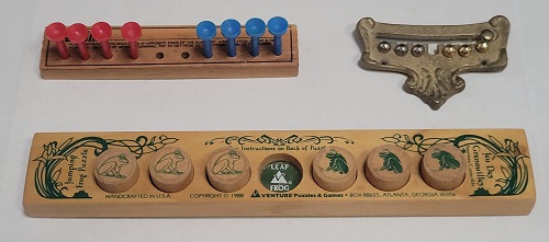 Variations on the draughtboard puzzle, where the object is to switch the sides the pieces are on by jumping. |