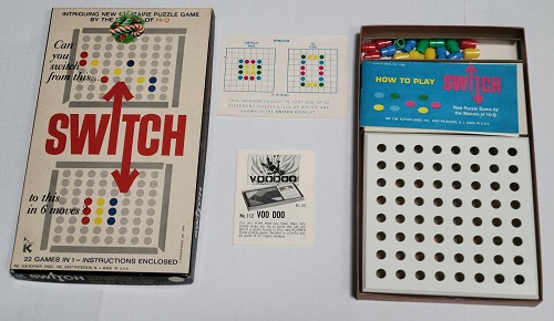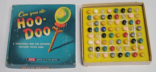 A Hoo-Doo puzzle, where the object is to arrange the pegs so that every color is in every row and column, but not more than once. I believe a few pegs are teh wrong color in my version. |
