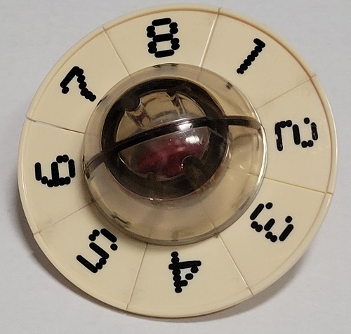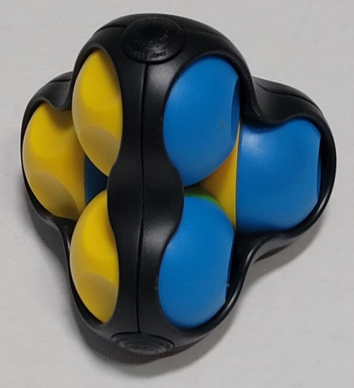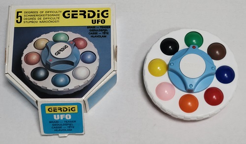 A Gerdig puzzle with the box. There are two layers, the top and the bottom and the balls are actually each two half spheres. |