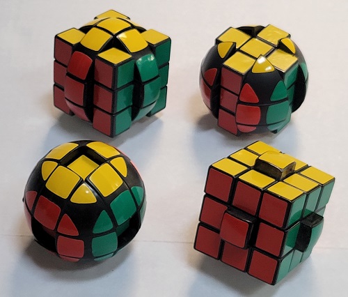 Three varations with diagonal slices. The one on the left has slices which are rotated 45 degrees. The middle puzzle is a case (or box) cube. The puzzle on the right is a Windmill cube. |