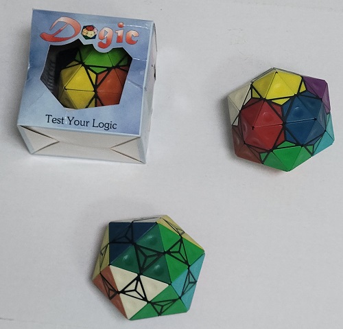 An original Dogic puzzle with box, along with a couple of more recent versions. The overall shape is that of an icosahedron. |
