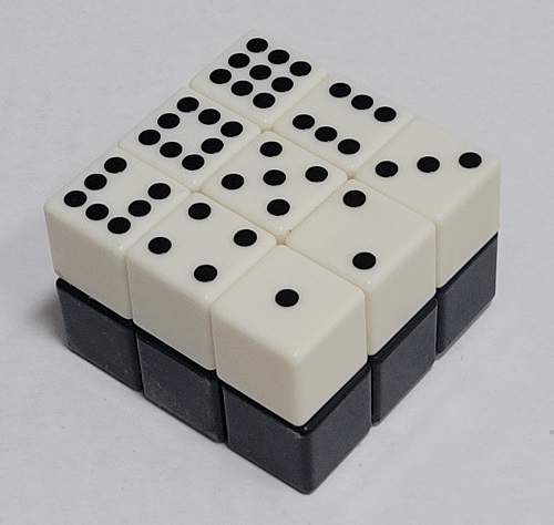 Domino cube. 2x3x3 cube with pips that look like dice or dominos. I do not believe this is an original, it is a more recent copy. |
