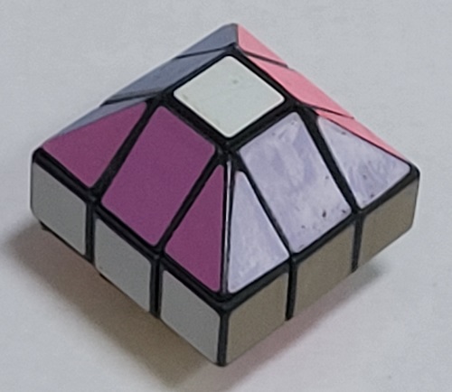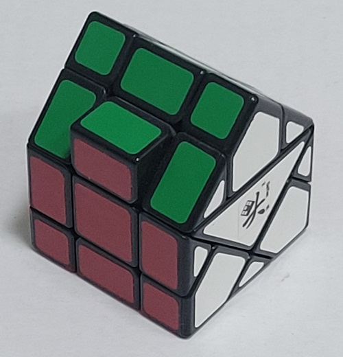A cube in the shape of a house. Notice the white face shows that this is more complicated than simply a 3x3x3 in the shape of a house. |