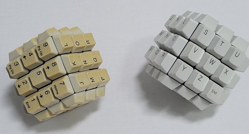 A couple of keyboard cubes. This is a simple variation to make, just use an old keyboard for parts and glue them to the cubes. As a side note, this enables the cube to be displayed standing on a corner. |