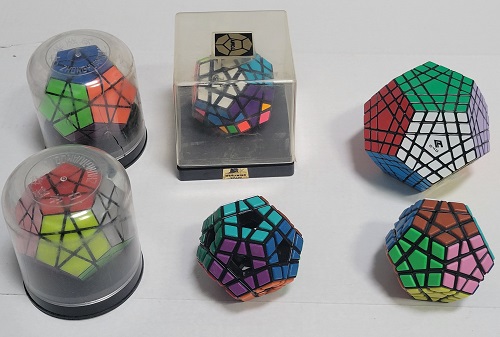 Several 12 sided puzzles. Included are some knockoffs, a Megamix, a version without centers, and a Gigaminx. All have a Dodecahedron shape, 12 sides. |