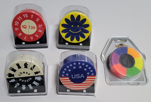 Rubik cube puzzles with essentially pictures on each face. These typically require the correct oreientation of the center piece on each face of the cube. |