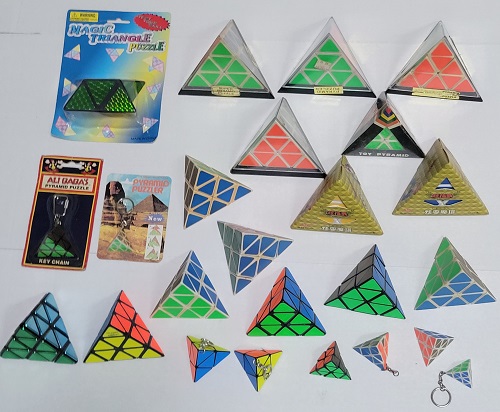 Various pyramid cubes. A couple Pyraminx along with numerous copies. |