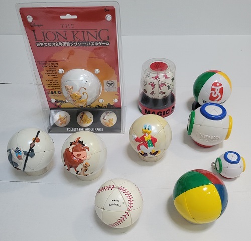 Various Rubik's cubes as balls. Most are 3x3x3, though three of the balls in the bottom row are 2x2x2. These often use common cicular objects, like the world (top row) or various balls (baseball, soccer ball, golf ball). |