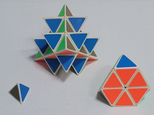Three simple custom made puzzles based on a pyraminx. One is stellated, one is truncated and one is simply a 1x1x1 left over pyramid. |