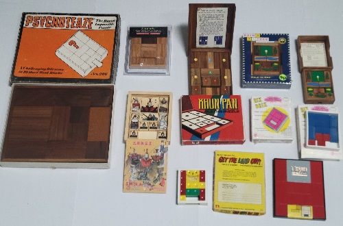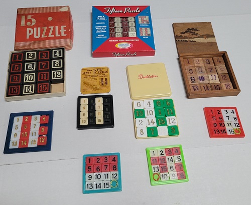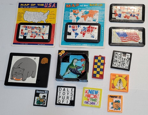 A variety of plastic slider puzzles depicting some of the variety of possible subjects. |