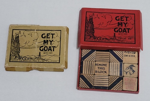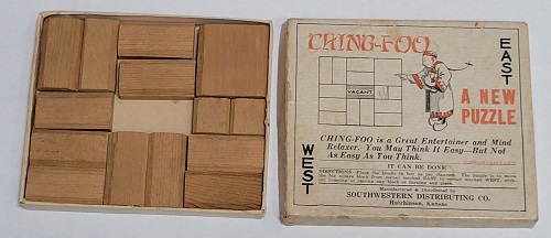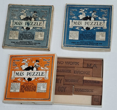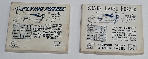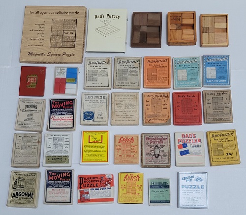 Dad's puzzles are some of the more common of the older block slider puzzles. Other names for this type of puzzle include: The Moving Puzzle, Leech Puzzle, Humdinger Puzzle, and Eskimo Pie Puzzle. |
