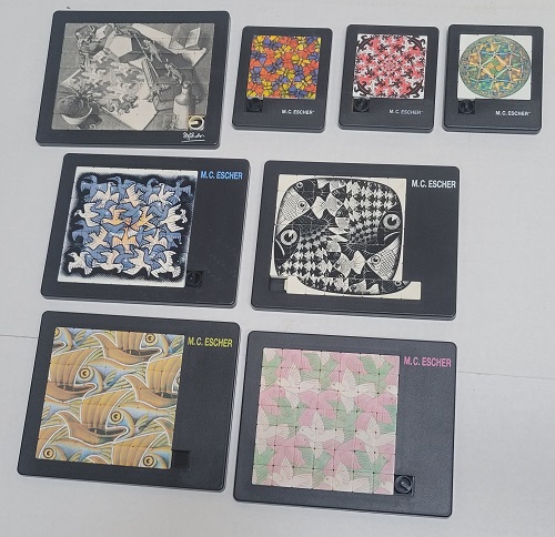 A variety of plastic slider puzzles depicting some of the artwork of M.C. Escher. |