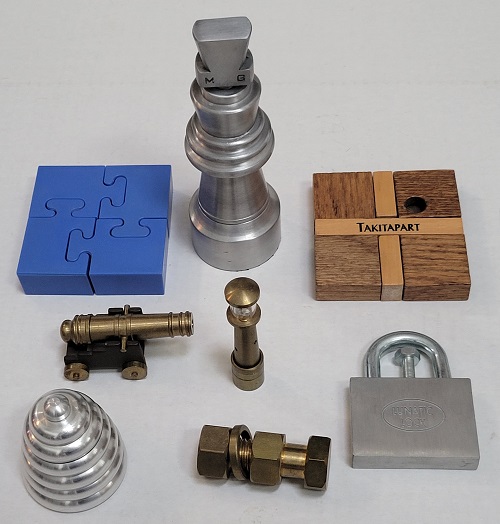 The puzzles in this category involve taking something apart or opening the puzzle up. Puzzle boxes are a common type of take apart puzzle, as are locks or bolts. Some of the puzzles have hidden compartments inside. The Hanayama brand of puzzles are included here because they are primarily take apart puzzles, but some of them might be viewed as falling into a different category.